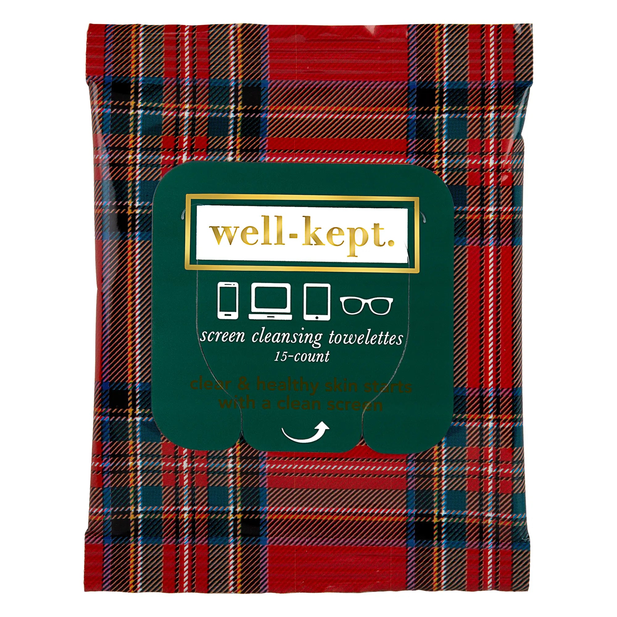 hand holding tea sachet that is a red & black plaid checkered pattern. tea sachet reads Winter Chai in white script, seasonal spiced chai black tea by big heart tea co, on white background.