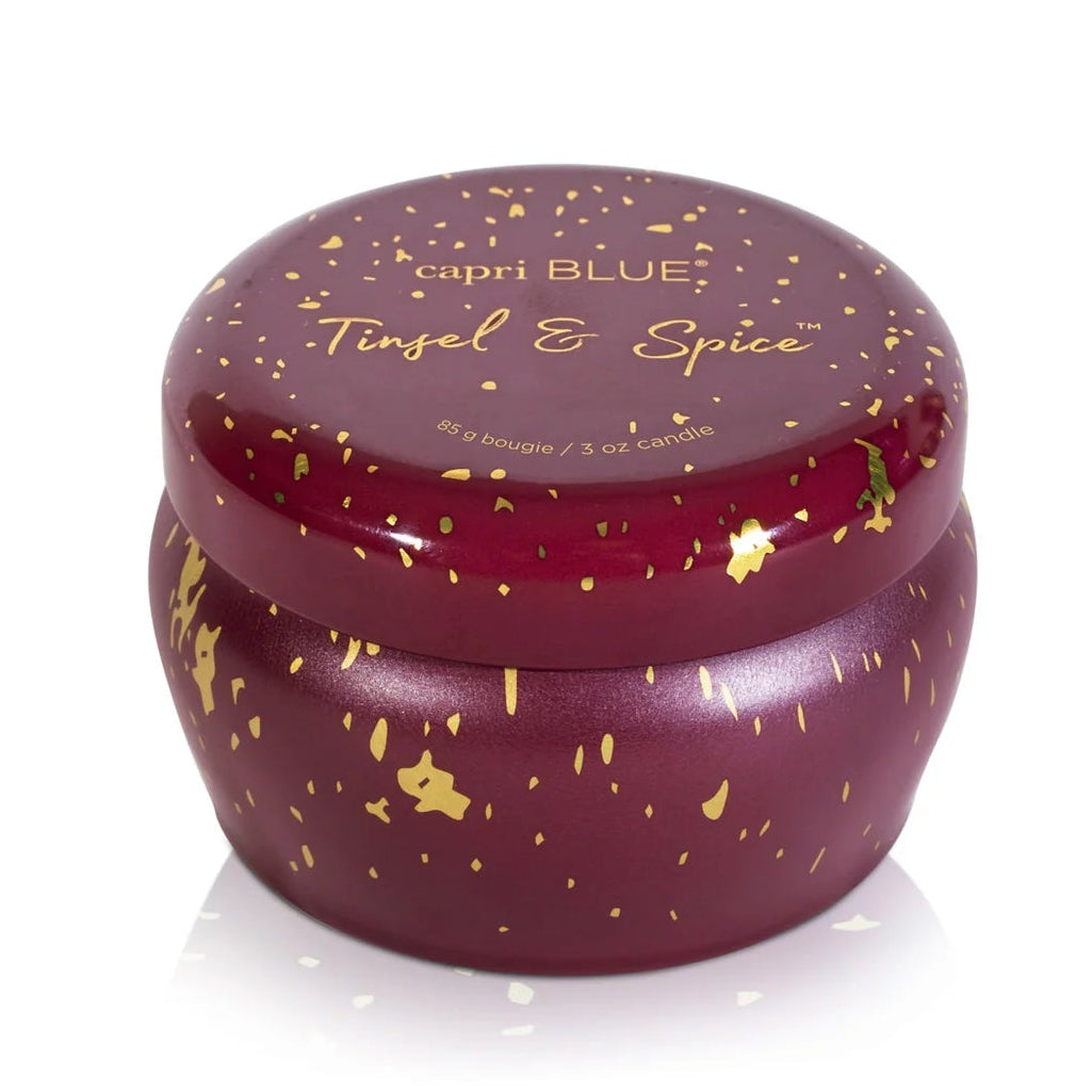 shiny red tin small round candle lit. lid is off to the side